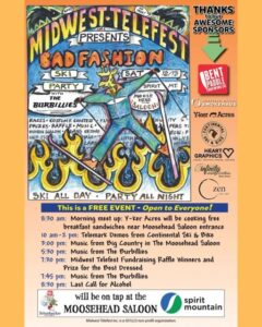 Continental Ski and Bike will provide free Telemark demos. Enjoy tunes from 2 bands for apres ski. Purchase new Midwest Telefest merch. Enter the raffle for new gear or some tasty meat from Y-ker Acres. Win a prize for the best bad fashion. Our beloved Telewhacker Ale (from Bent Paddle) will be on tap at the Moosehead Saloon