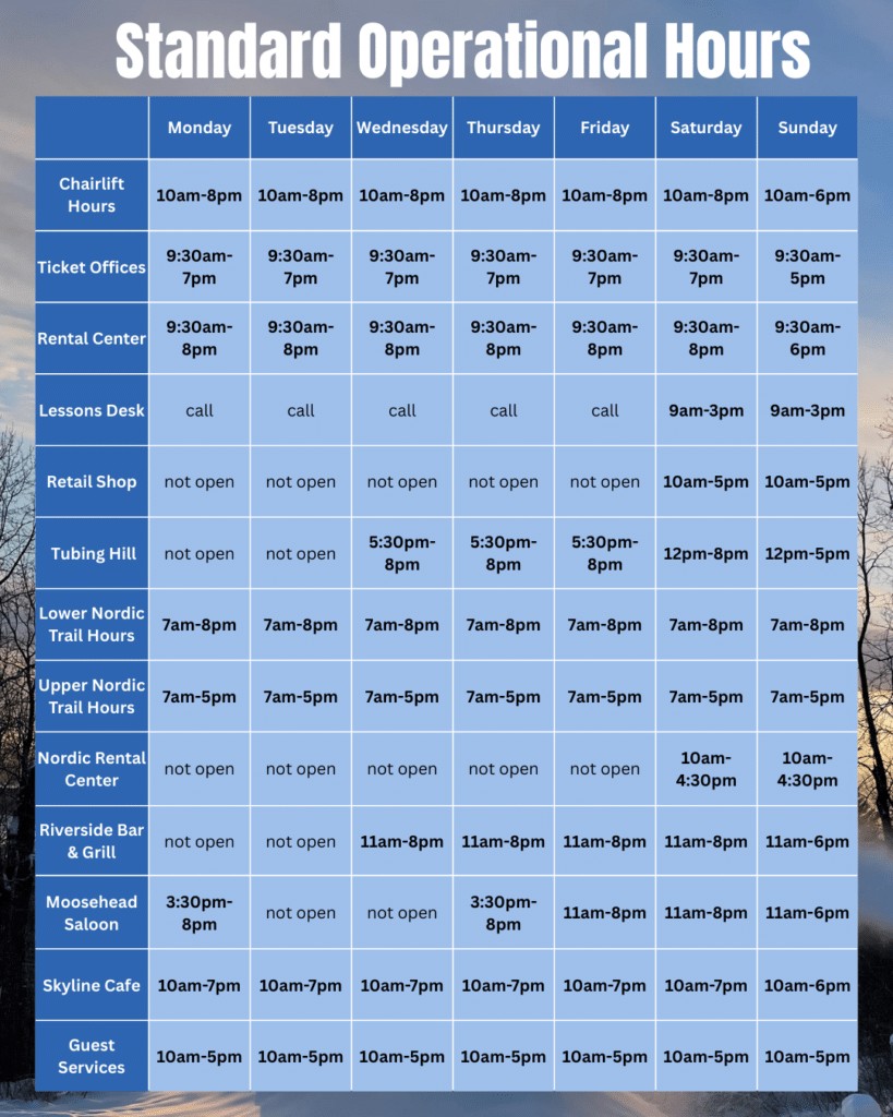 Our lift hours are consistent throughout the season. We often extend our hours during holiday periods like Christmas, New Years, MLK weekend, and President’s Weekend.